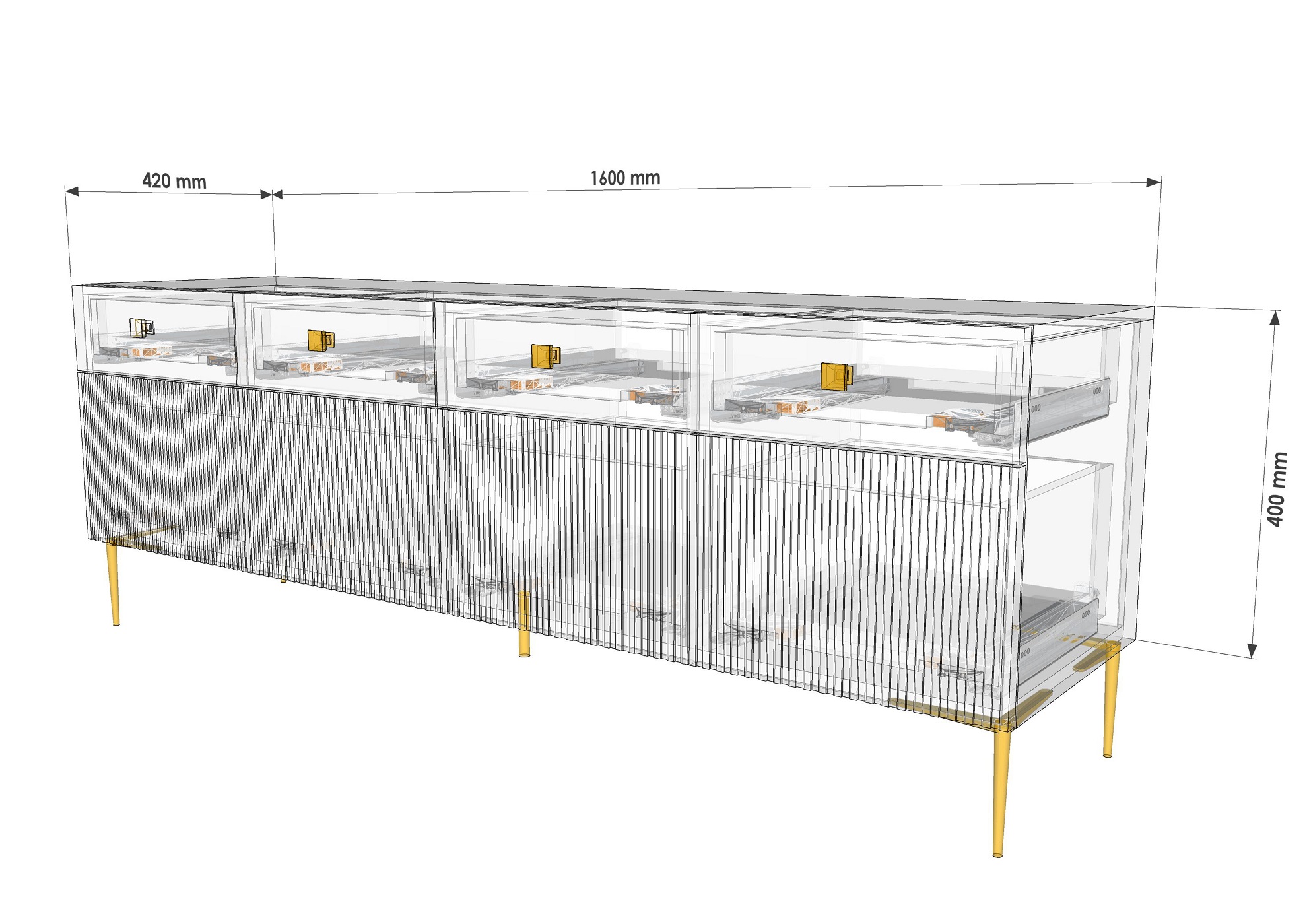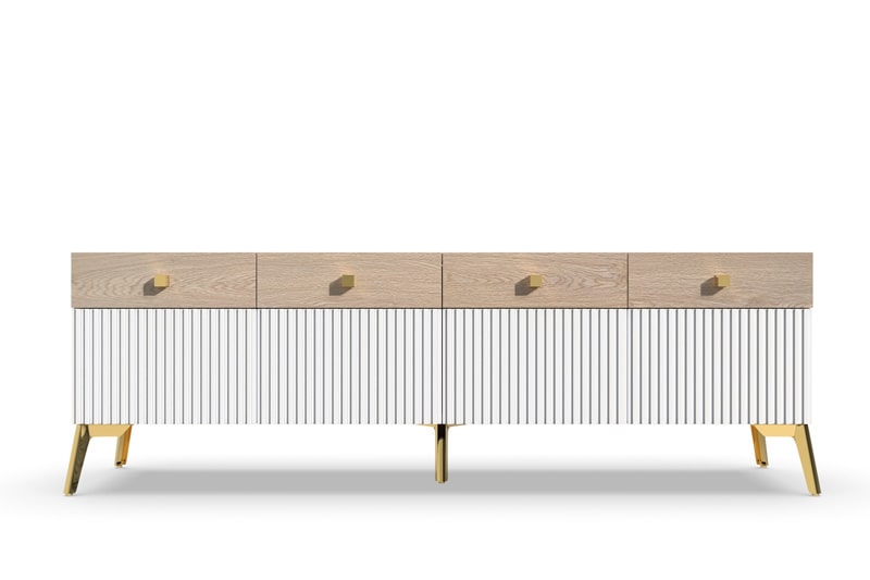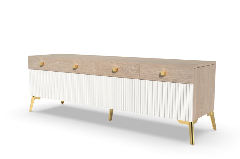 Тумба под ТВ Темпо имеет просторную полку для размещения телевизора и два ящика для хранения различных предметов, таких как кабели, диски и пульты дистанционного управления. Рифленые поверхности на фасадах ящиков добавляют оригинальности и стиля этой тумбы.