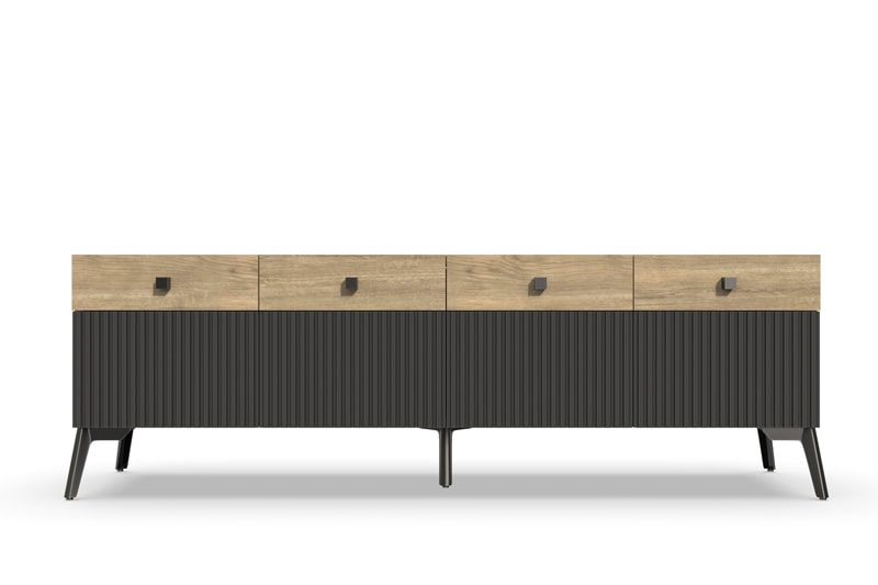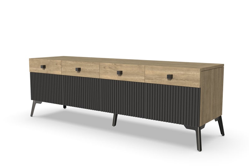 Тумба под ТВ Темпо от фабрики Geona - это красивое и практичное решение для тех, кто ценит качество и удобство. Она выполнена с использованием рифлёных поверхностей в двух цветах - Дуб Галифакс натур. 8177 и Софт блэк.
